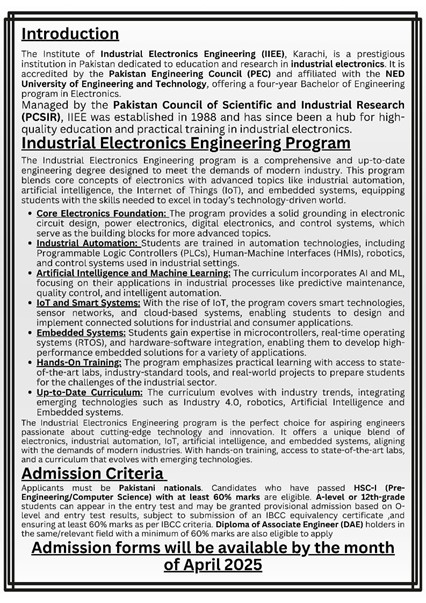Some Self-Finance seats are available at the Institute of Industrial Electronics Engineering (IIEE).